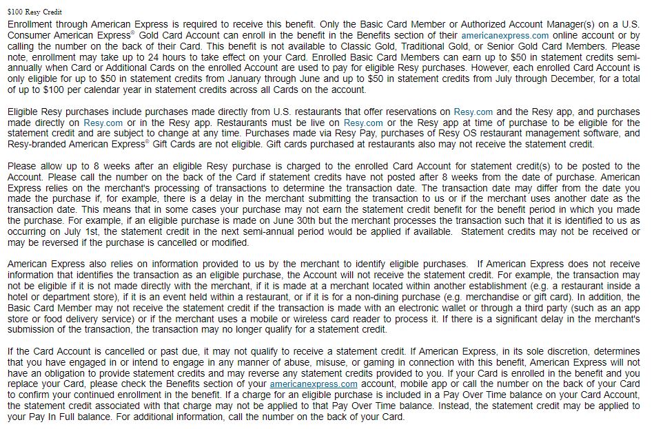 - $100 Resy Credit: Receive up to $50 in statement credit from January through June, and up to $50 July through December for eligible Resy purchases. That includes purchases at restaurants that are listed on Resy, and direct purchases through resy.com.