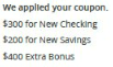 The offer gives you a $900 total bonus, but it comes in two parts that can be done separately. You’ll receive $300 for opening a checking account, $200 for a savings account, and an extra $400 if you do both.