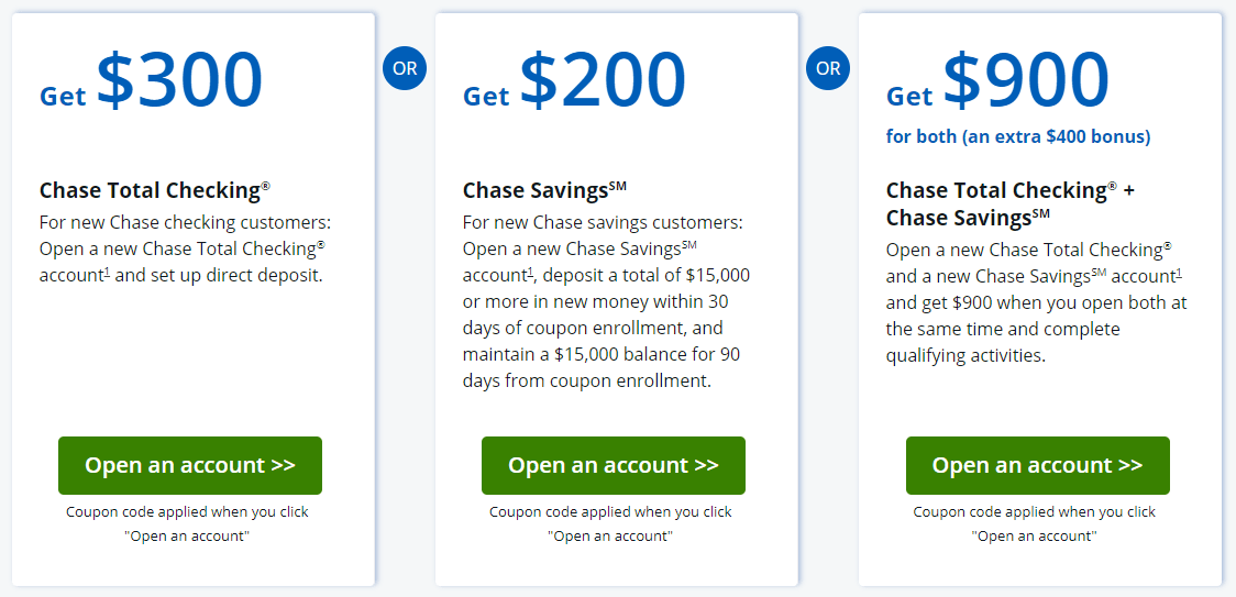 Chase frequently offers a $600 for those who open a new checking and savings account. But now we are seeing once again a rare $900 bonus with the same requirements. This is a great opportunity and the bonus might not last long. So at least claim a unique promo code right away by entering your email. Check out the details of this Chase Checking/Savings $900 bonus below.