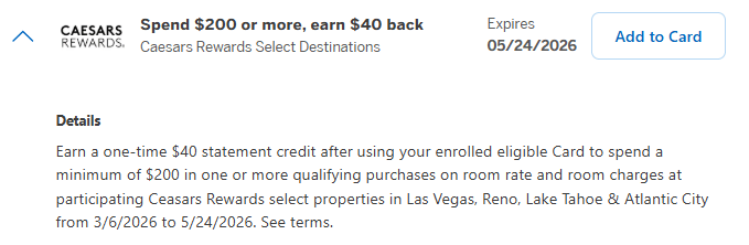 Earn a one-time $40 statement credit after using your enrolled eligible Card to spend a minimum of $200 in one or more purchases on room rate and room charges at participating Caesars Rewards select properties in Las Vegas, Reno, Lake Tahoe & Atlantic City from 3/6/2026 to 5/24/2025.
