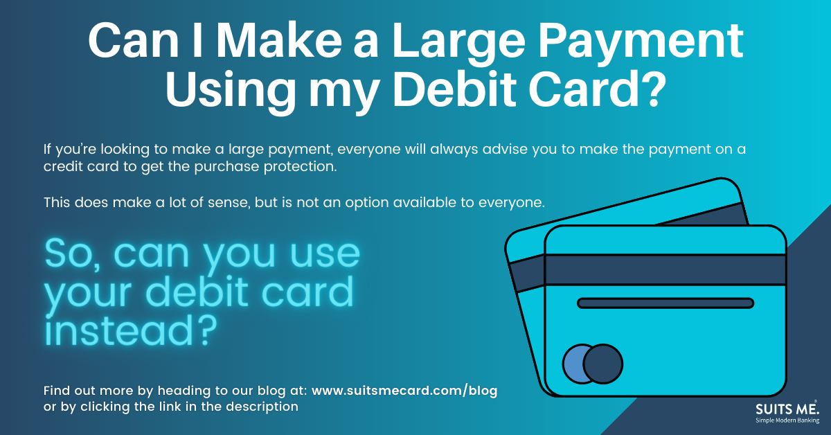 Yes. You can use your debit card, including your Suits Me card, to make large payments – just ensure you have enough funds and that your account doesn’t exceed its spending cap.