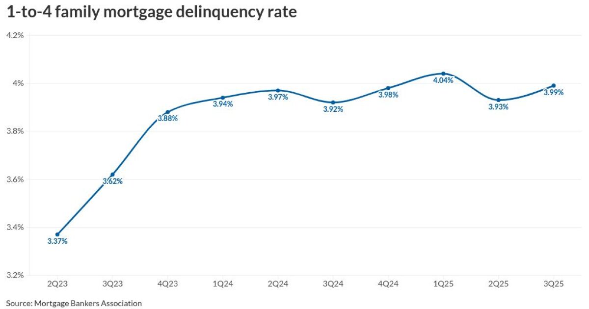 Delinquent mortgages made up 3.99% of all outstanding loans when seasonally adjusted in the third quarter, up from 3.93% in the second quarter and 3.92% one year prior.