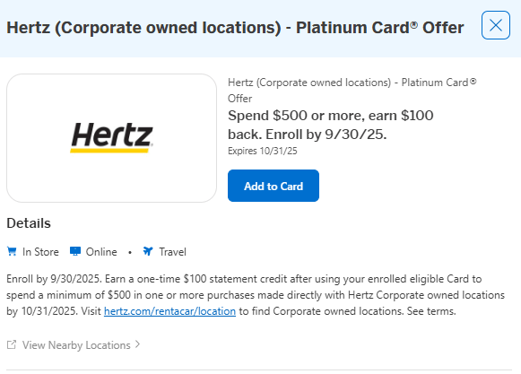 Enroll by 9/30/2025. Earn a one-time $100 statement credit after using your enrolled eligible Card to spend a minimum of $500 in one or more purchases made directly with Hertz Corporate owned locations by 10/31/2025. Visit hertz.com/rentacar/location to find Corporate owned locations