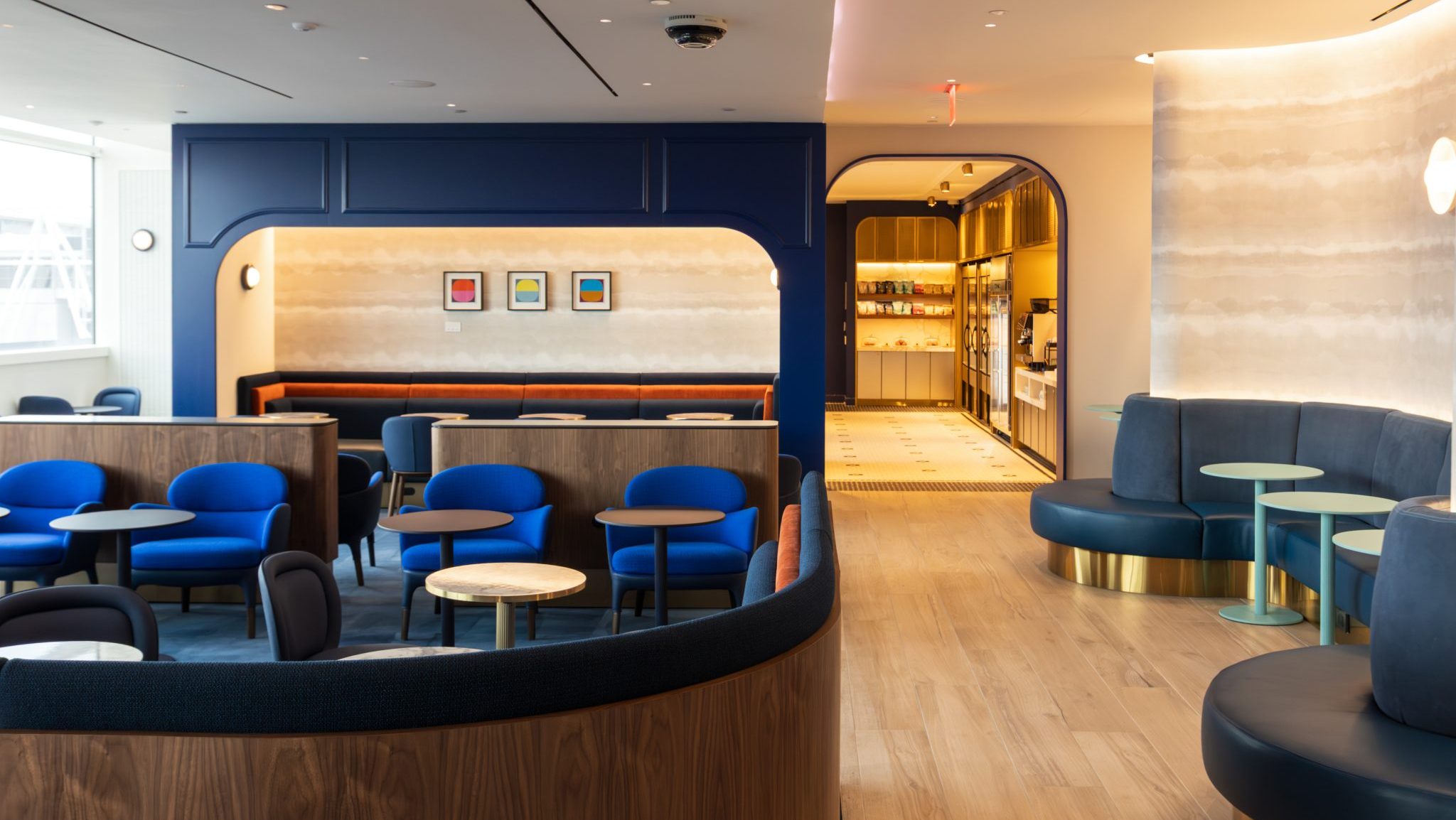 • 9,000 square feet and two floors bring an NYC apartment–style aesthetic to JFK Terminal 5 with Art Deco design, curated local art and playful nods to JetBlue’s history.