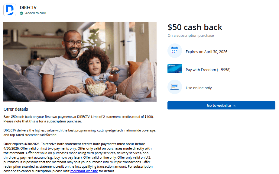 • Earn $50 cash back on your first two payments at DIRECTV. Limit of 2 statement credits (total of $100).