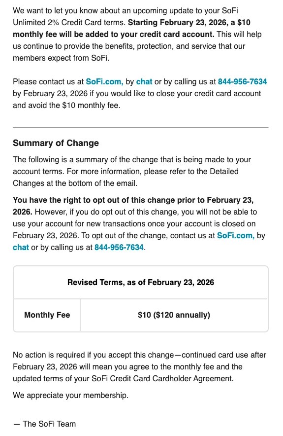 SoFi has sent out email to select SoFi Unlimited 2% Credit Card members saying that the card will have a $10 monthly fee starting February 23, 2026. Not everyone has received this email, and SoFi reps have noted that only those who have received notification will have the new monthly fee added to their accounts.