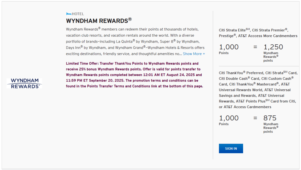 Transfer Citi ThankYou Points to Wyndham Rewards with 25% Bonus Transfer Citi ThankYou Points to Wyndham Rewards with 25% Bonus